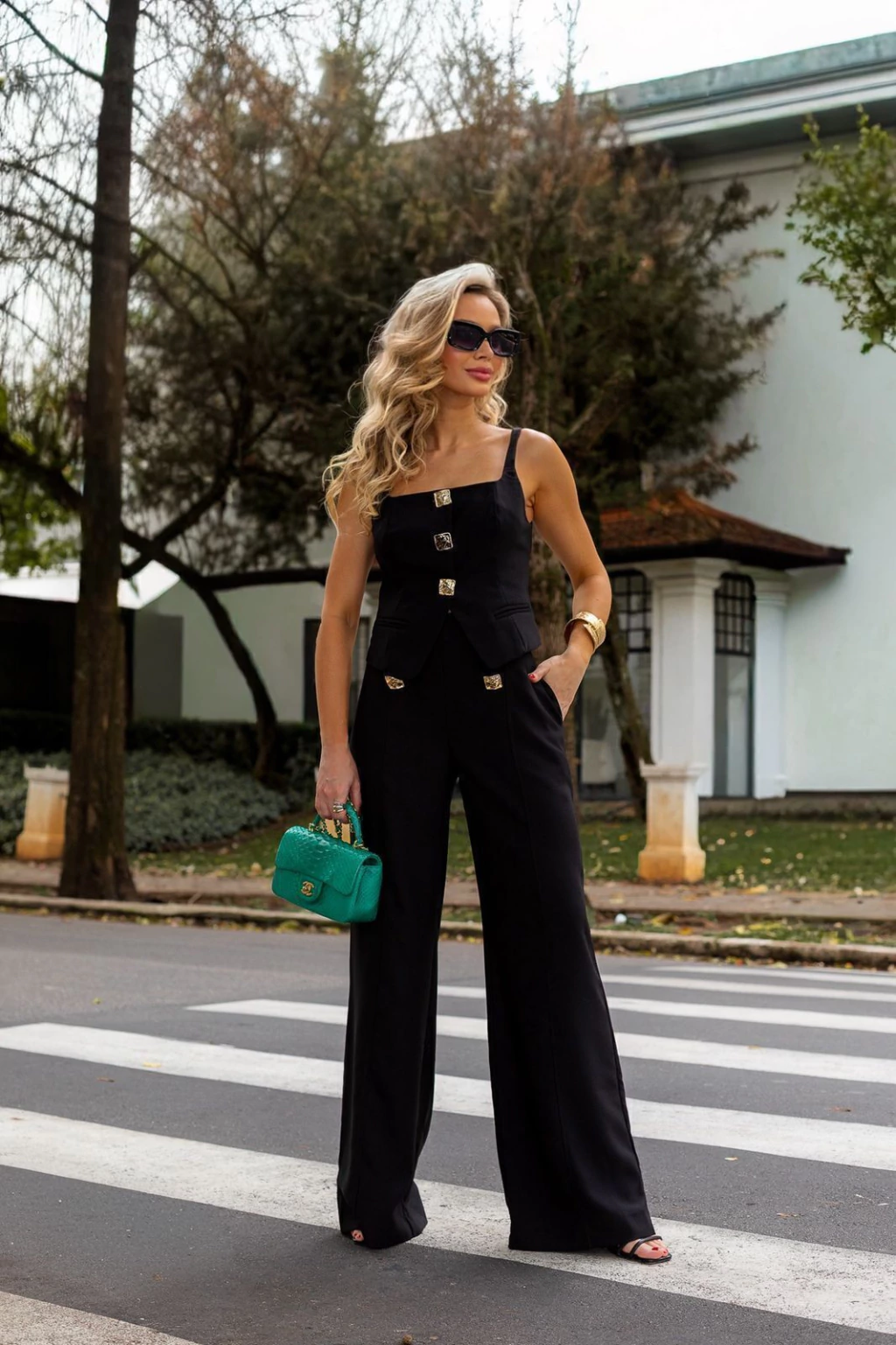 Este look apresenta um conjunto em alfaiataria preta de caimento impecável, composto por um top estruturado com alças finas e botões dourados trabalhados, que acrescentam sofisticação ao visual. A calça wide leg de cintura alta harmoniza perfeitamente com o top, trazendo elegância e movimento fluido graças ao tecido encorpado. Os detalhes metálicos valorizam ainda mais a produção, enquanto a bolsa verde adiciona um toque moderno de cor. Uma combinação chic, contemporânea e cheia de estilo.