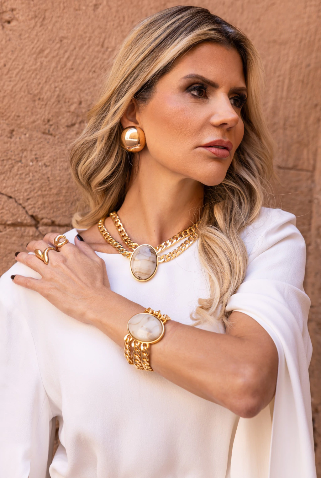 Pulseira resin bege e marrom e tambem disponivel em pirita levemente marmorizada com correntes banhadas em verniz italiano douradas medindo 19 cm. Uma pulseira que não é apenas um acessório, mas uma afirmação de estilo e personalidade. Uma pulseira que diz tudo sem dizer uma palavra. Morrendo de amores por aqui. Um luxo sem igual. Não precisa nem de legendas, basta a foto. Mais uma peça da coleçao exclusiva desenvolvida em atelier com banho de ouro e antialérgico com design único.